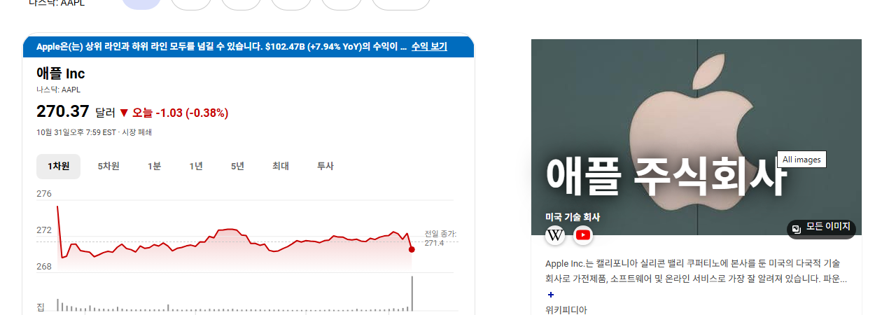 - 변동성 관리: 하지만 기술주 전반의 변동성, 인플레이션 및 금리 정책, 그리고 글로벌 지정학적 리스크 등 거시 경제 요인에 따라 단기적인 등락은 언제든지 발생할 수 있습니다. 현재 주가는 $270.37(2025년 10월 31일 종가 기준)입니다.