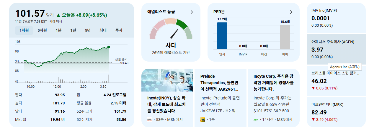 • 주가 반응: 이러한 긍정적인 소식에 힘입어 INCY 주가는 장중 사상 최고가인 $101.79를 기록했으며, 8.65% 상승한 $101.57로 마감했습니다.