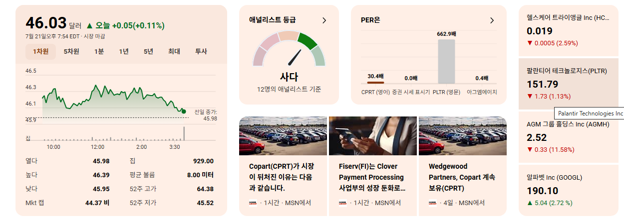 • 코파트(CPRT)의 최근 시장 부진은 단기적인 거래량 감소와 밸류에이션 조정의 복합적인 영향으로 보입니다. 이는 회사의 근본적인 사업 모델의 강점이나 시장 지배력에 대한 구조적인 위협으로 판단하기 어렵습니다.