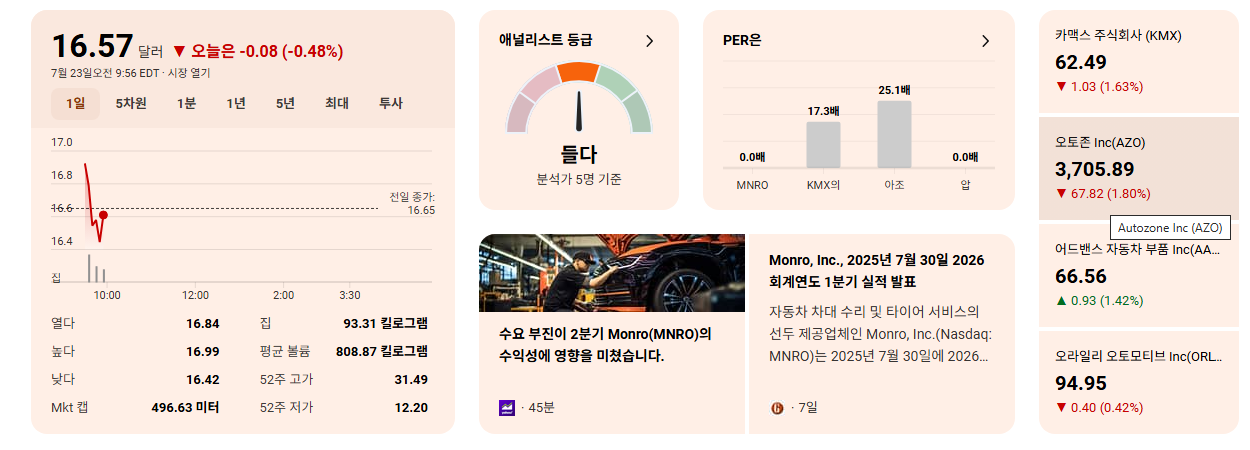 - 주가 흐름: MNRO 주식은 지난 52주간 31.11% 하락했으며, 이는 장기적인 투자자 신뢰가 약화되었음을 나타냅니다. 비록 최근 1개월간 21.36%의 단기 반등이 있었지만, 이는 지속적인 하락 추세 속에서 나타난 일시적인 기술적 반등일 가능성이 높습니다.