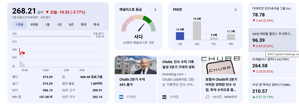 • 견고한 재무 상태와 성장세: 비록 최근 실적 우려가 있지만, CB는 52주간 7.19%의 주가 상승률을 기록하며 꾸준한 가치 상승을 보여왔습니다. 이는 글로벌 보험 시장에서의 강력한 입지와 안정적인 사업 모델을 바탕으로 한 것입니다.
