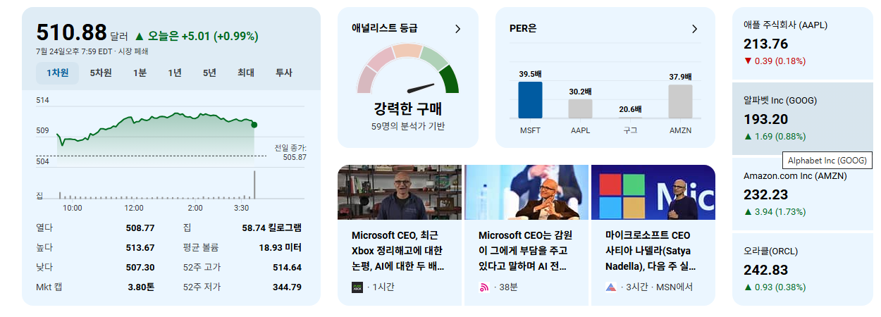 - 장기적인 관점의 매수: MSFT는 견고한 펀더멘털, 지속적인 혁신 능력, 그리고 AI와 클라우드라는 거대 트렌드의 중심에 있다는 점에서 장기 투자 매력이 매우 높습니다. 시장 조정 시 분할 매수를 고려해 볼 수 있는 '퀄리티 성장주'입니다.