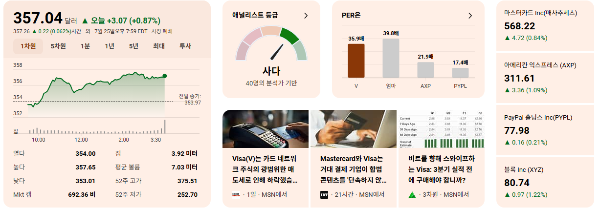 - 단기적인 하락세에도 불구하고, V는 지난 한 달간 1.54%의 양호한 수익률을 기록했으며, 지난 12개월 동안은 무려 36.43% 상승하며 견조한 성장세를 입증했습니다. (2025년 7월 24일 종가 기준)