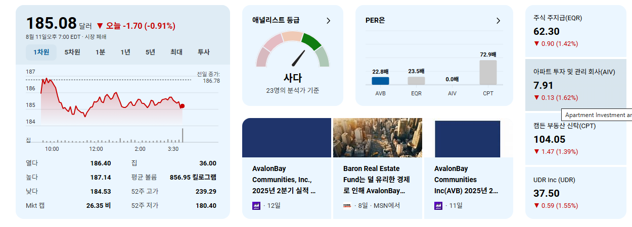 - 주거용 REIT로서 AVB의 실적은 고용률, 임금 성장, 주택 구매 여력, 이자율 등 거시 경제 변수에 크게 영향을 받습니다. 애널리스트의 긍정적 평가는 이러한 외부 환경 속에서도 AVB의 펀더멘털이 강력하게 유지되고 있음을 시사합니다.