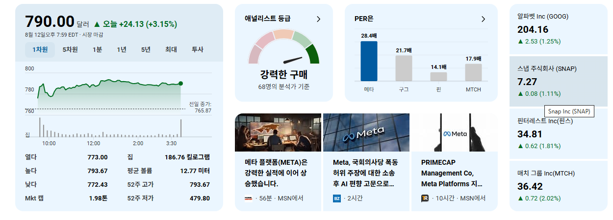 - 주가는 주당 790.00달러로 마감되었고, 시가총액은 1.985조 달러에 달하며, 이는 META의 시장 내 지배적인 입지가 더욱 강화되었음을 보여줍니다.