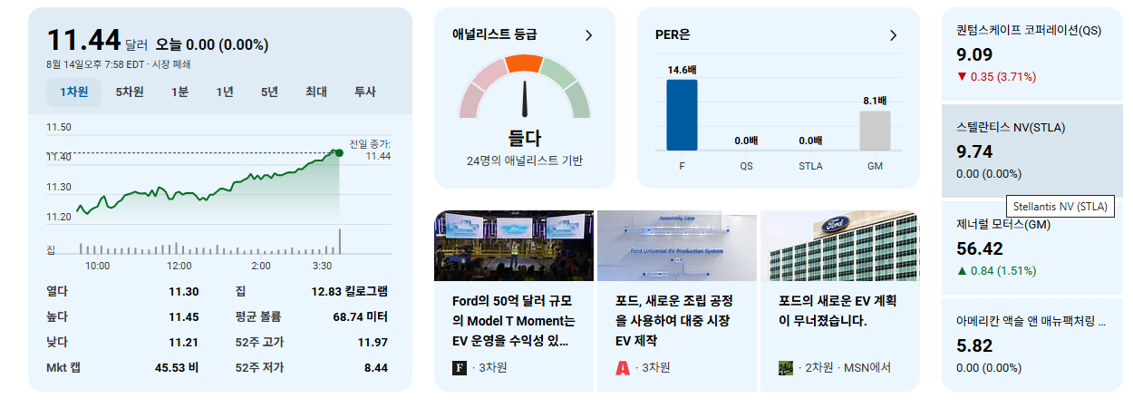 - 성장 잠재력 탐색: RBC 캐피탈의 평가처럼, 포드의 EV 전환 및 수익성 개선 노력이 성공적으로 진행된다면 추가적인 주가 상승 여력이 있을 수 있습니다.