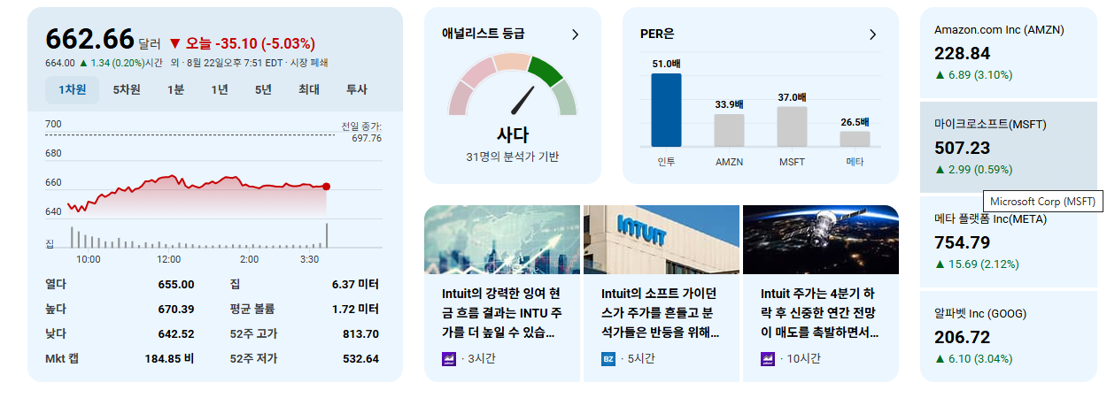 - 장기적인 관점 유지: INTU는 지속적인 혁신과 서비스 확장을 통해 고객 충성도를 높이고 있습니다. 단기적인 주가 변동보다는 회사의 장기적인 성장 궤적과 시장 리더십에 주목하는 것이 현명한 투자 접근 방식이 될 것입니다.