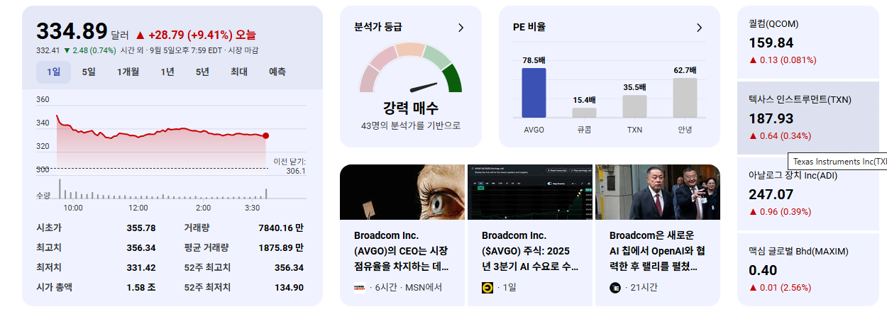 - 주가 사상 최고치 경신: 브로드컴 주가는 뉴스 발표 후 장중 한때 16.4% 급등했으며, 최종적으로 9.41% 상승한 $334.89로 마감하며 새로운 기록을 세웠습니다.