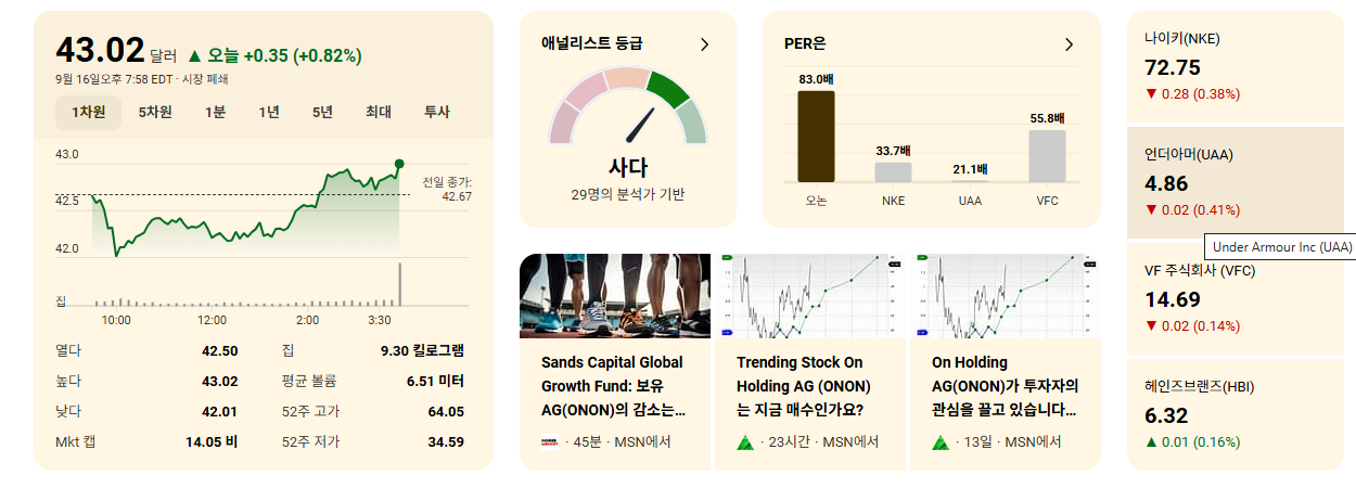 ONON은 스위스 기반의 고성능 러닝화 및 의류 브랜드 'On'을 운영하고 있으며, 혁신적인 쿠셔닝 기술인 'CloudTec'으로 유명합니다. 최근 몇 년간 빠른 성장세를 보여왔고, 운동선수 및 패션 시장 모두에서 인지도를 높였습니다. 경쟁사로는 나이키(NKE), 아디다스(ADDYY), 룰루레몬(LULU) 등이 있으며, ONON은 이들 대기업 사이에서 차별화된 브랜드 이미지와 기술력으로 틈새시장을 공략해왔습니다.성장 모멘텀 둔화 우려와 시장 경쟁 심화