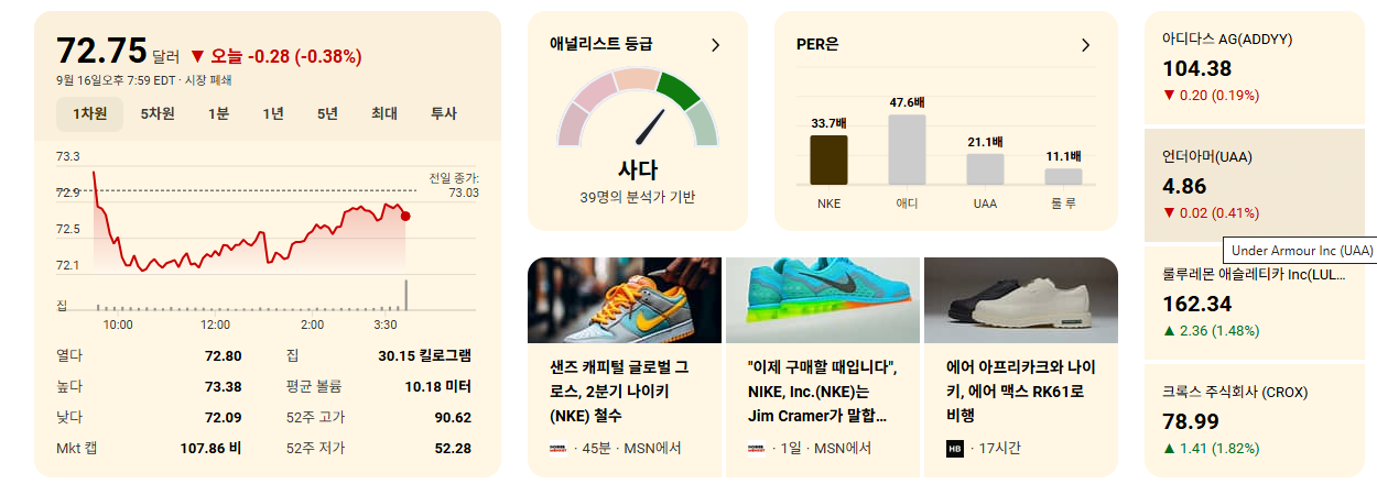 - 투자 심리 위축 및 매도 압력: 대형 기관의 매도는 단기적으로 NKE 주가에 대한 투자자들의 심리를 위축시키고 매도 압력을 가할 가능성이 큽니다. 실제로 기사에 따르면 NKE의 1개월 수익률은 -4.60%, 52주 수익률은 -10.07%를 기록하며 이미 부진한 흐름을 보였습니다.