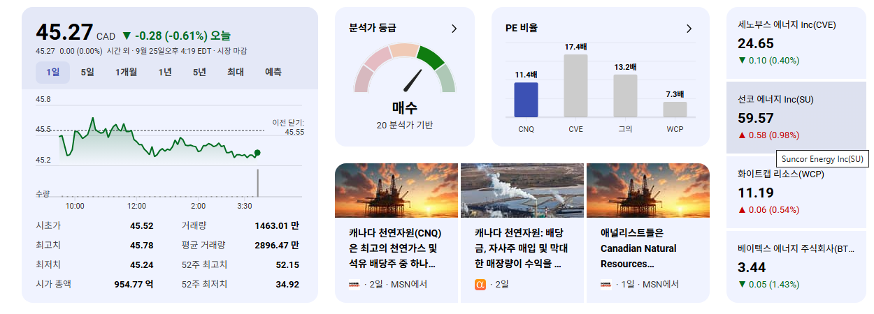 - 종합 평가: CNQ는 애널리스트들의 "Moderate Buy" 컨센서스와 함께 탄탄한 사업 확장 전략, 그리고 매력적인 주주 환원 정책을 겸비한 에너지 섹터의 강자입니다.