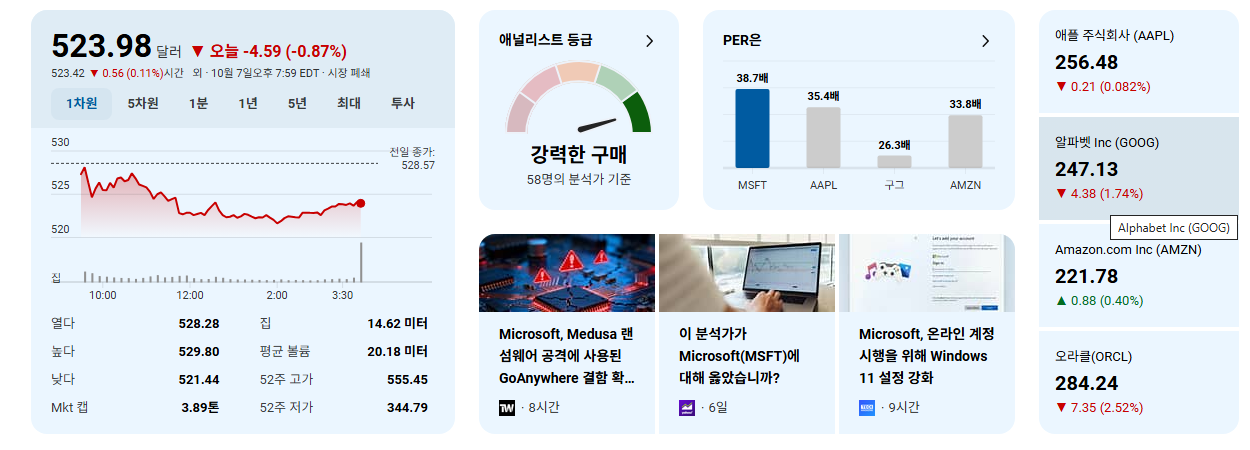 - 월스트리트 애널리스트들은 이러한 성장 모멘텀을 바탕으로 마이크로소프트 주가에 대한 긍정적인 전망을 유지하며, 최고 목표 주가 680달러를 제시했습니다. 이는 10월 3일 종가 517.35달러 대비 약 31%의 추가 상승 여력을 의미합니다.