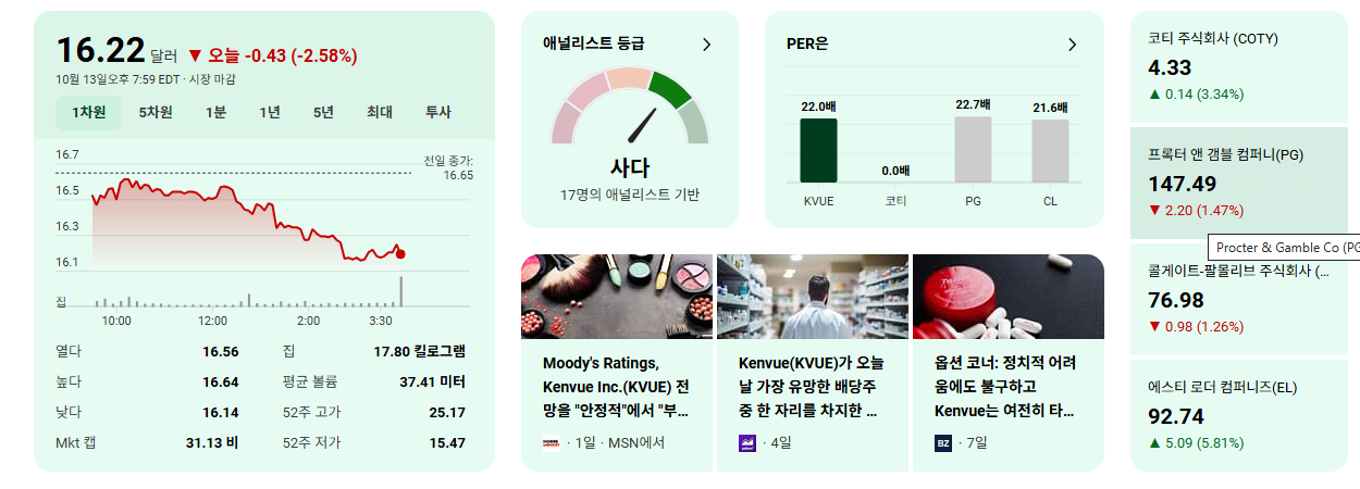 - 보수적 투자자: 현재 켄뷰는 매우 높은 불확실성과 리스크를 안고 있으므로, 투자를 보류하고 관망하는 것이 현명합니다. 법적, 규제적 이슈가 명확하게 해결되고 회사의 장기 성장 전략이 가시화될 때까지 기다리는 것을 추천합니다.