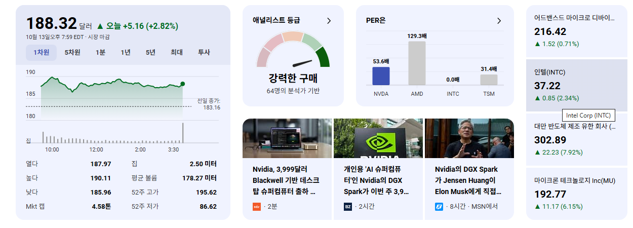 - AI 시장 지배력: NVDA는 AI 반도체 시장의 명백한 선두주자이며, CUDA 생태계와 소프트웨어 경쟁력을 바탕으로 압도적인 해자를 구축하고 있습니다. TSMC의 호실적은 이러한 NVDA의 장기적인 성장 스토리를 더욱 강화하는 증거입니다.