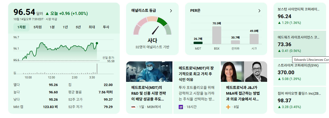 - 재무적 안정성과 주주 환원: MDT는 48년 연속 배당금을 인상한 배당 귀족주(Dividend Aristocrat)로서, 분기당 0.71달러의 배당금과 2.98%의 배당 수익률(10월 12일 기준)을 제공하며 투자자들의 관심을 끌고 있습니다.